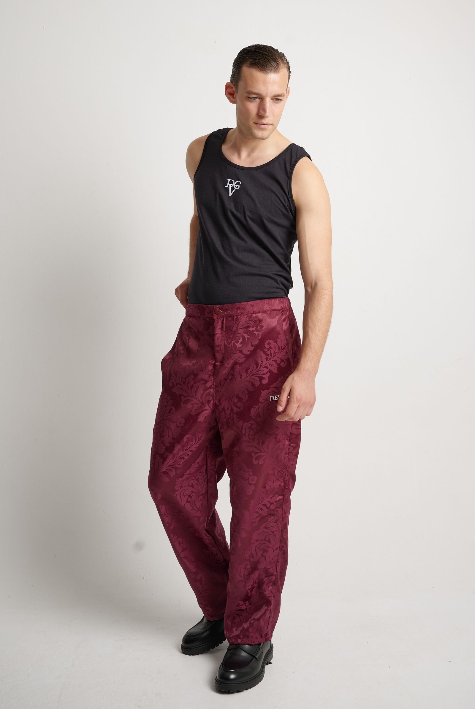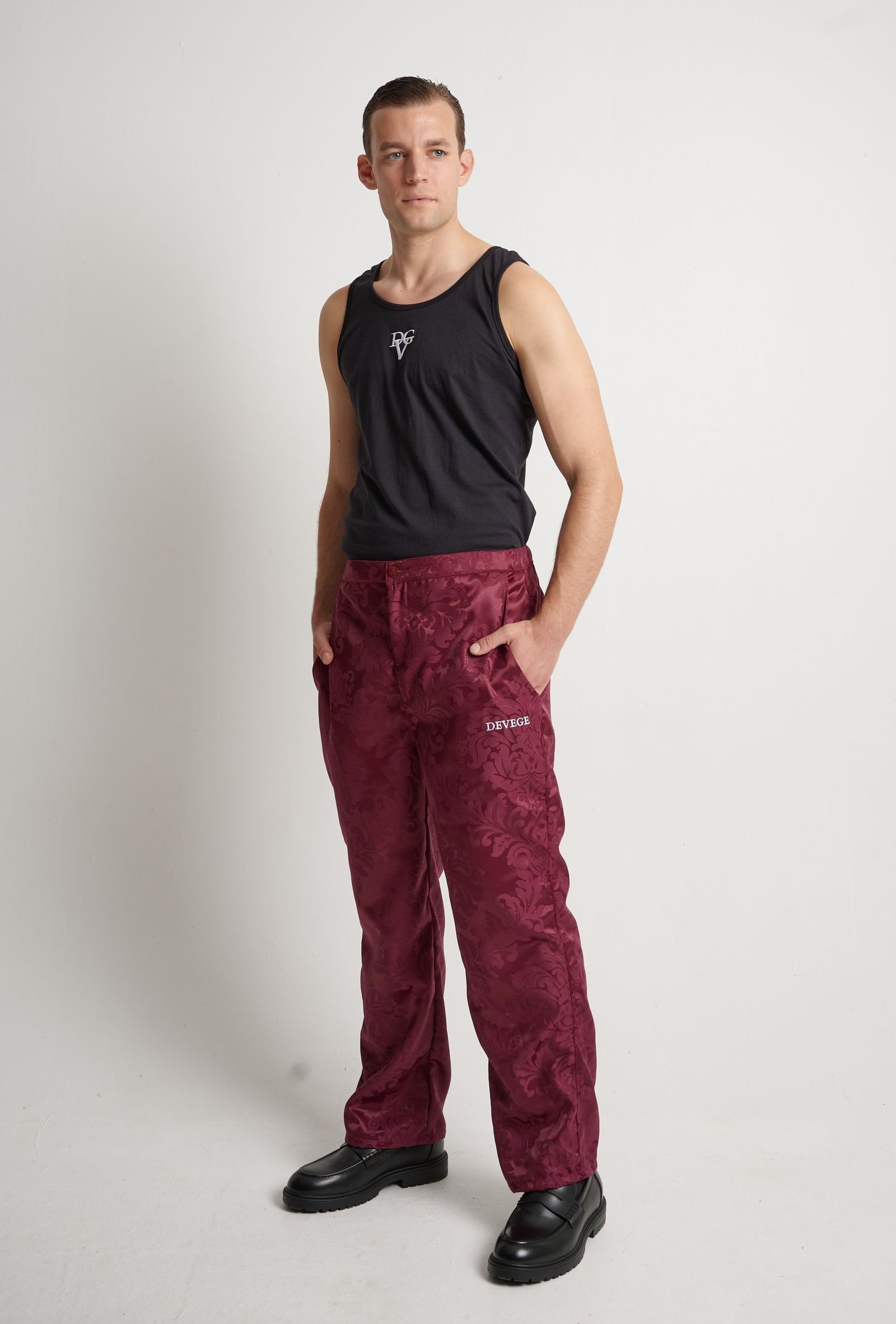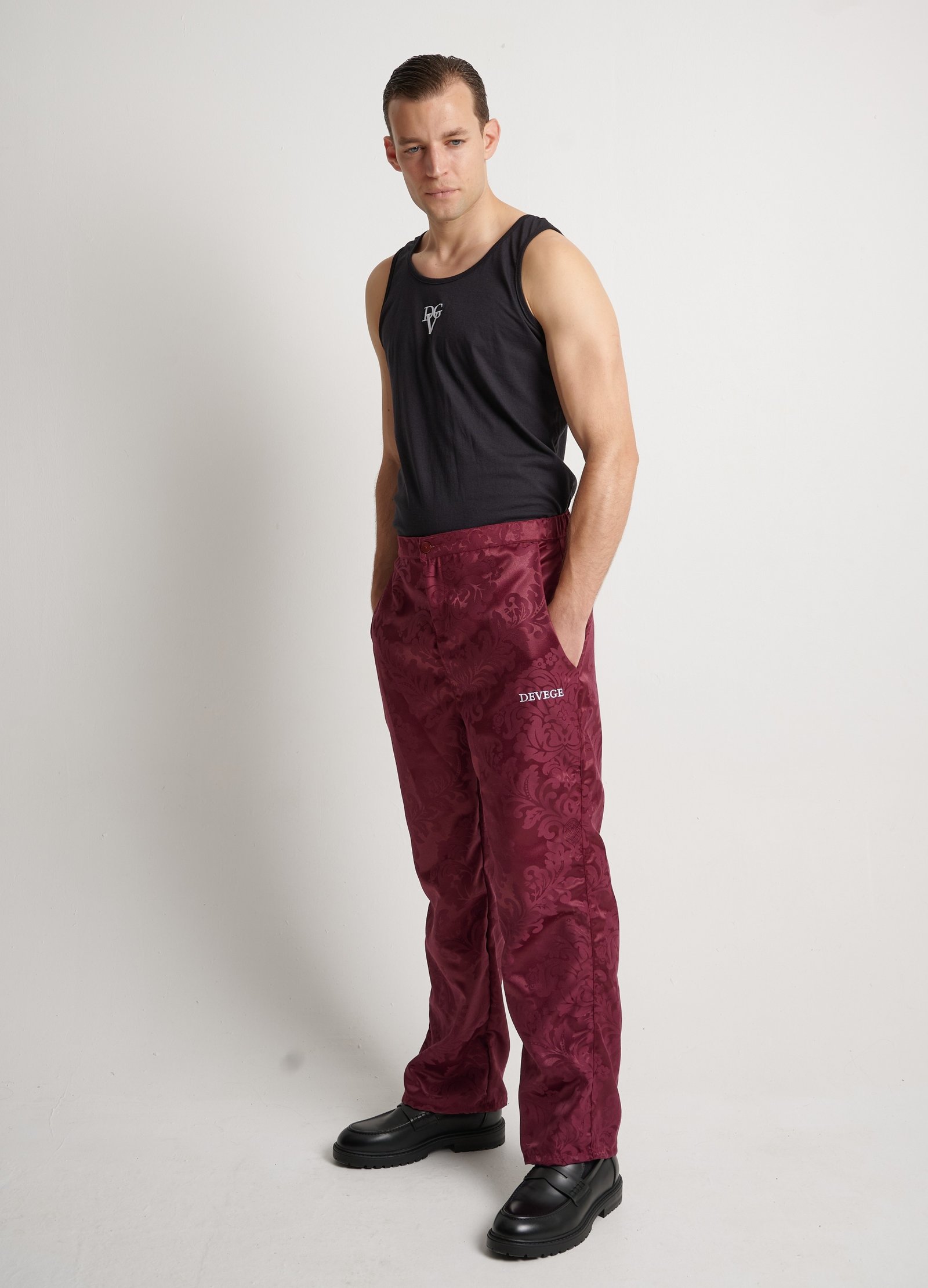 El tejido damasco jacquard satinado burdeos (burgundy satin jacquard damask fabric) aporta un relieve elegante y un brillo sofisticado que cobra vida con el movimiento, proyectando fuerza y carácter.
